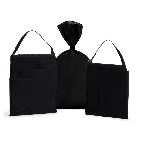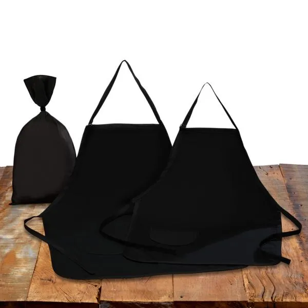 Composto por avental em tamanho padrão e avental em tamanho pequeno. Ambos possuem bolso frontal, tiras para amarrar na cintura e pescoço com regulagem de altura.