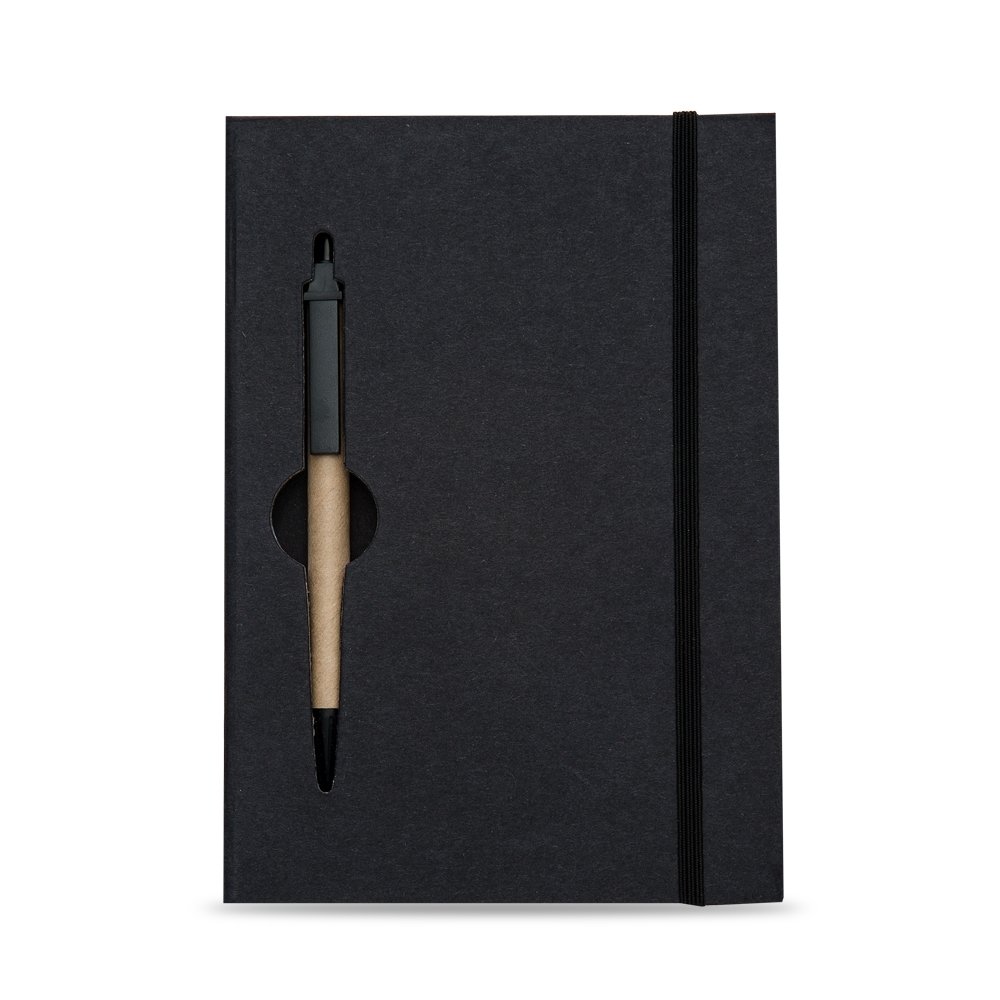 Caderneta ecológica com capa e miolo vazados, utilizados como suporte para a caneta. Bloco com miolo de picote, elástico para lacre e caneta de papelão com detalhes plásticos, carga esferográfica na cor azul e acionamento por clique.