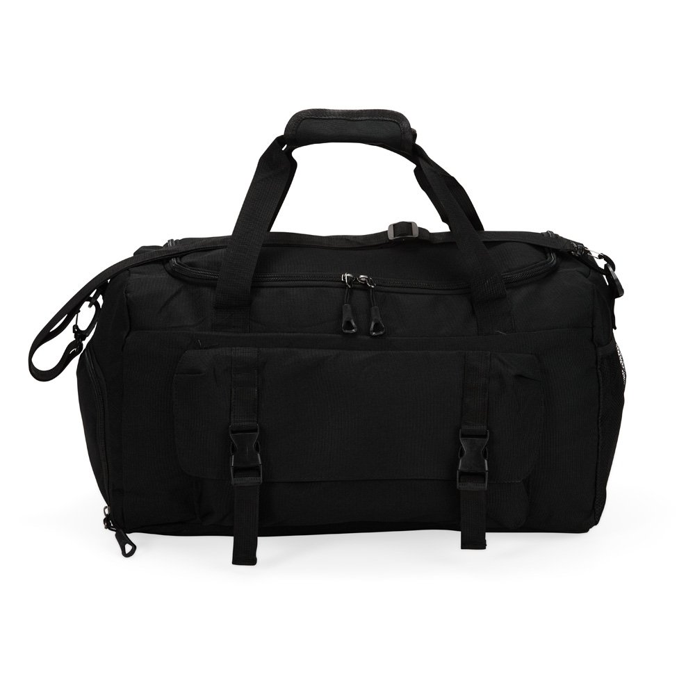 Bolsa esportiva de 39 litros em nylon resistente à água com três compartimentos, sendo um deles exclusivos para tênis. Compartimento principal com bolso de zíper exclusivo para itens molhados. Com bolso lateral telado e alças de mãos com suporte de juntura, a bolsa contém alça transversal removível e alça para engate em malas de viagem.