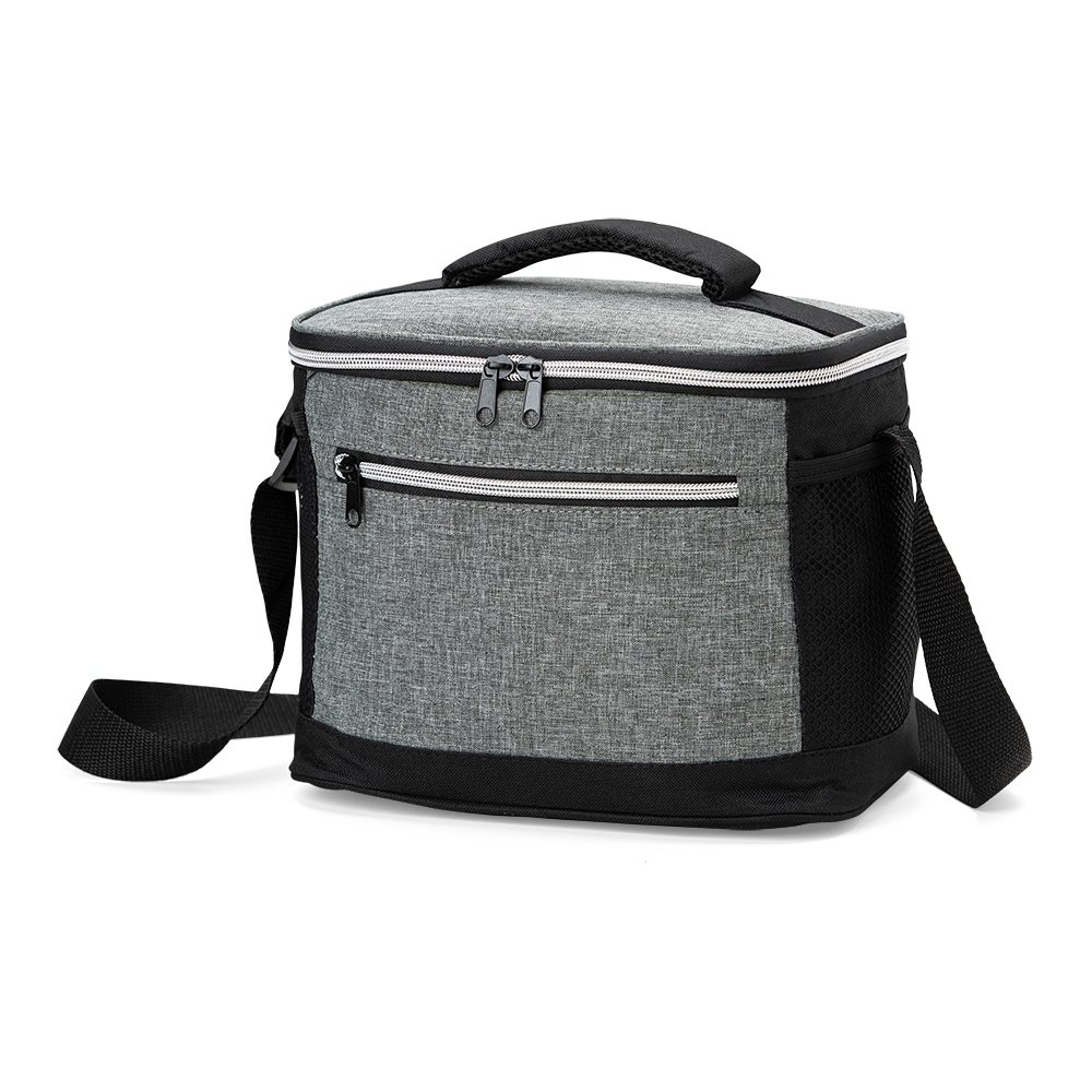 Bolsa térmica de nylon 10 litros com dois compartimentos e bolsos laterais em malha. Compartimento principal com revestimento térmico.