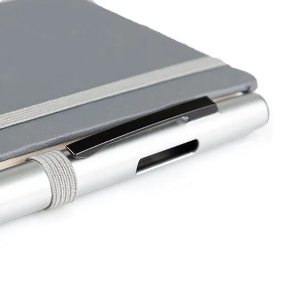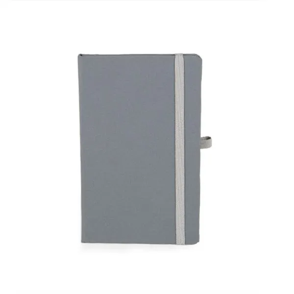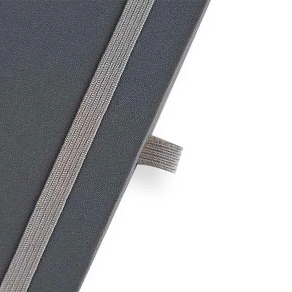 Caderno para anotações cinza com capa dura.