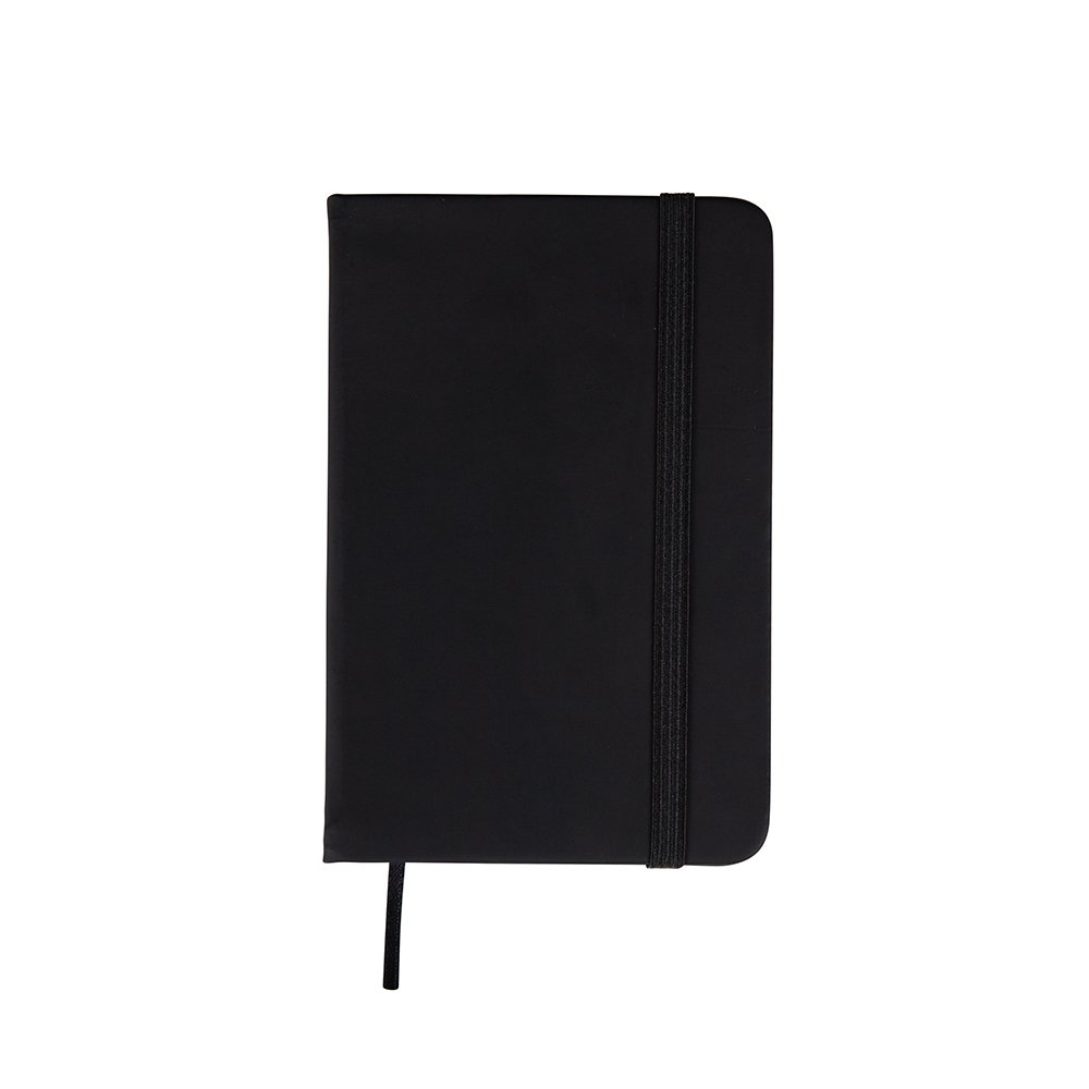 Caderneta emborrachada com marcador de página em cetim e fita elástica para fechar. Contém aproximadamente 80 folhas amareladas com pauta.