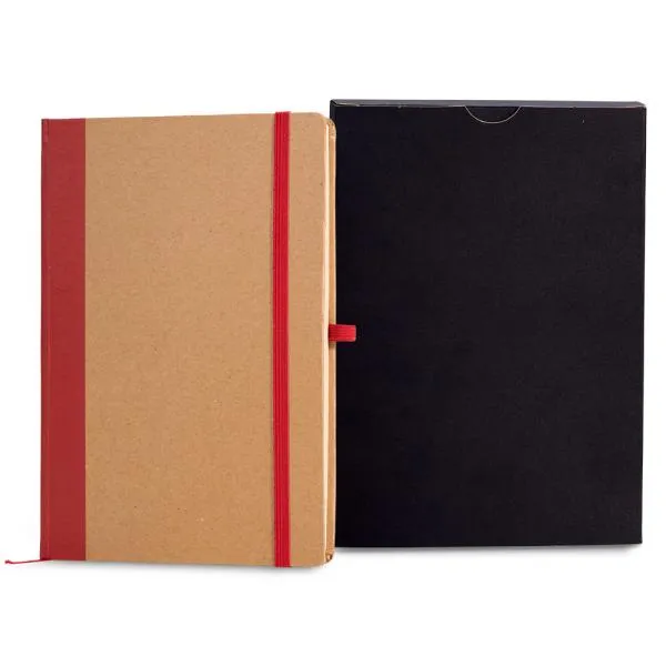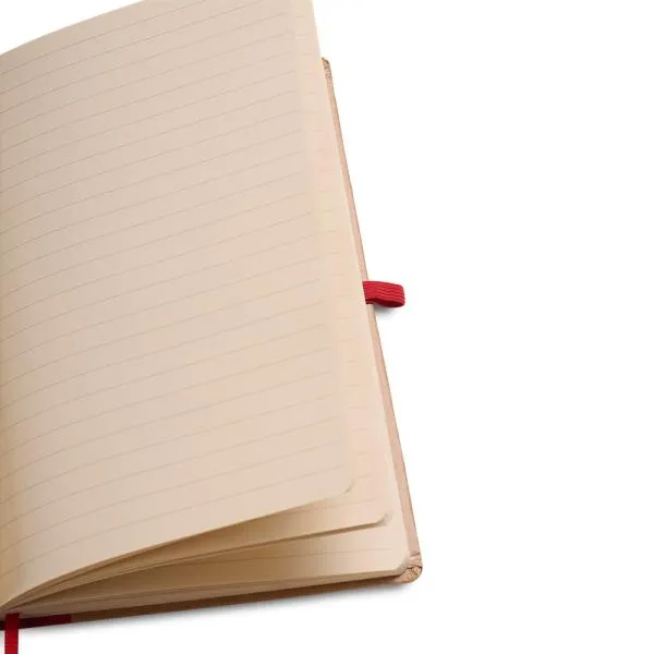 Caderno para anotações vermelho com capa dura.