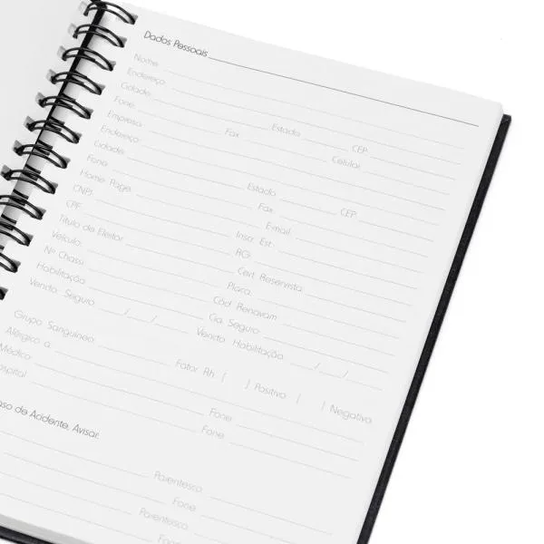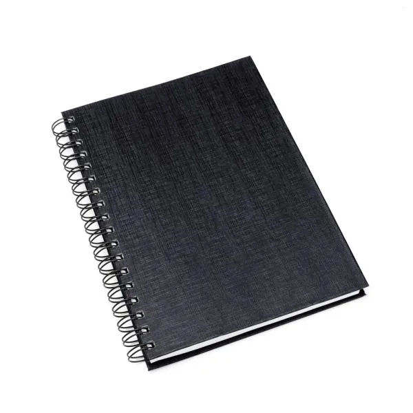Caderno para anotações wire-o preto com capa dura revestida em percalux linho.
