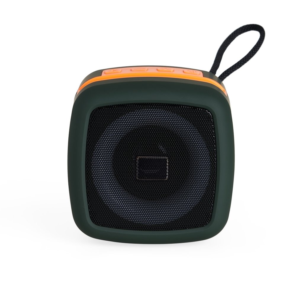 Caixa de som multimídia em plástico com espaço superior para encaixe do celular e base com revestimento antiderrapante. Oferece conectividade Bluetooth e entrada auxiliar P2, além de cartão TF (microSD) e USB-C, permitindo a reprodução de arquivos MP3. Acompanha cordão de nylon e cabo USB-C para carregamento.