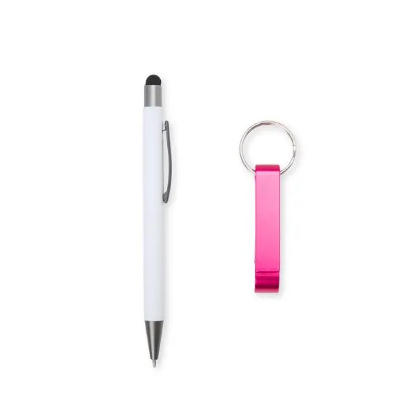 Composto por caneta esferográfica em alumínio branca e chaveiro abridor de garrafa e latinha em alumínio rosa.