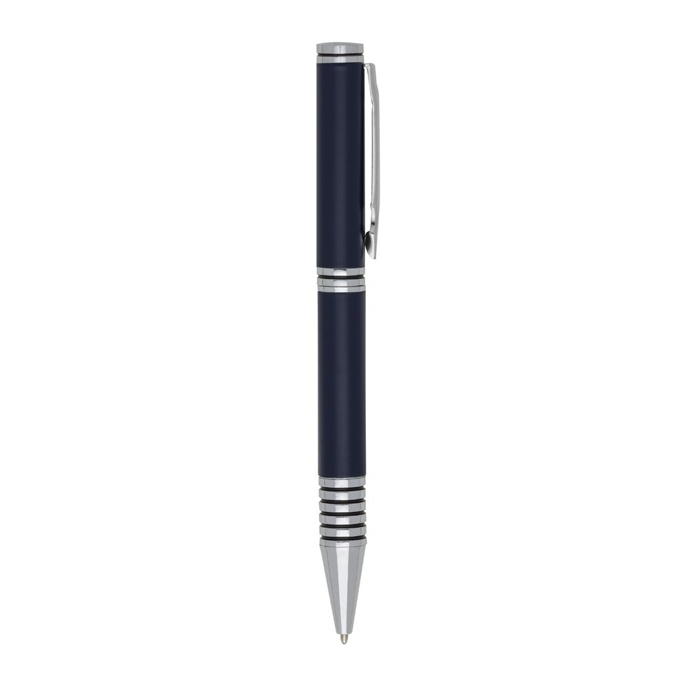 Caneta metálica com carga esferográfica azul e acionamento por rotação.