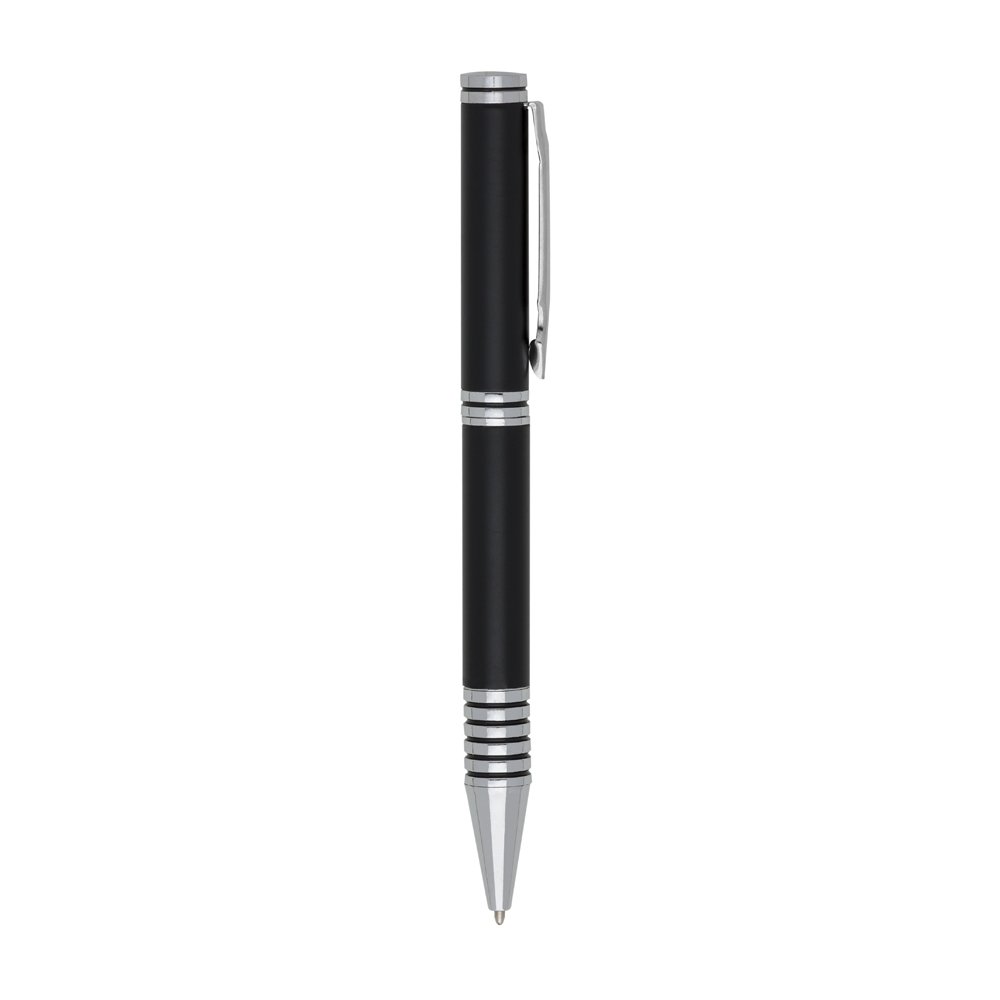 Caneta metálica com carga esferográfica azul e acionamento por rotação.