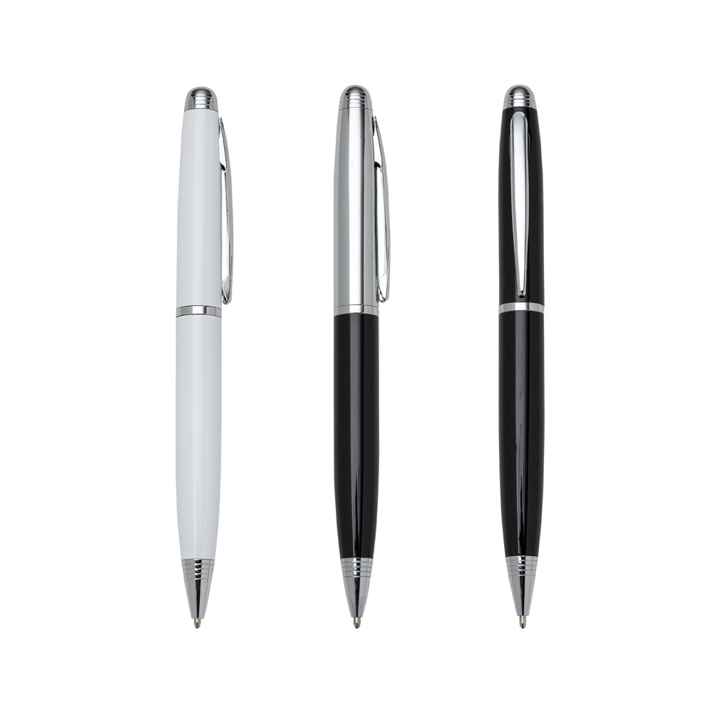 Caneta metálica com carga esferográfica azul e acionamento por rotação.