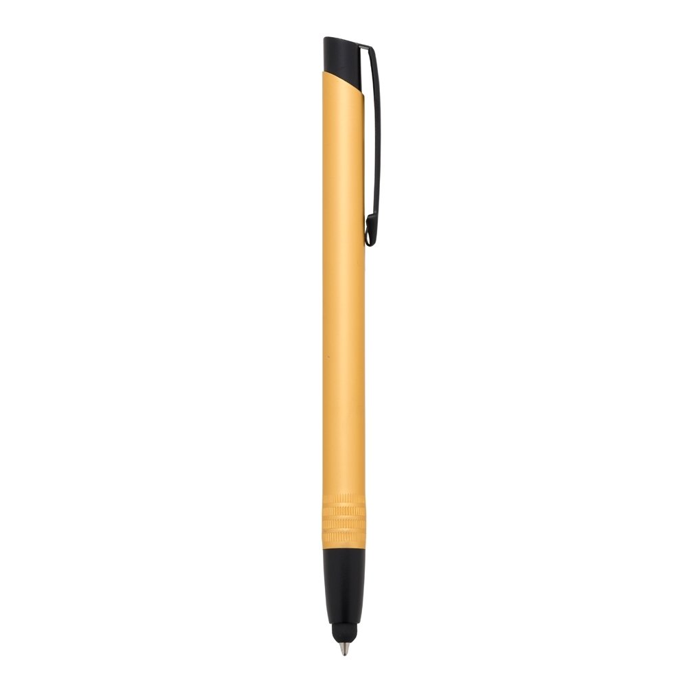 Caneta metálica com ponteira touch screen, carga esferográfica azul e acionamento por clique.