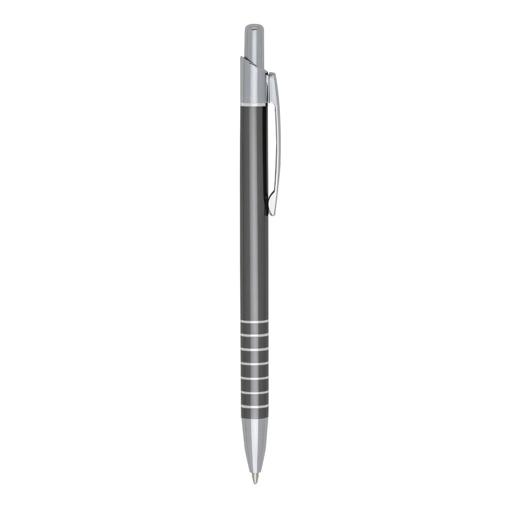 Caneta metálica com carga esferográfica azul e acionamento por clique.
