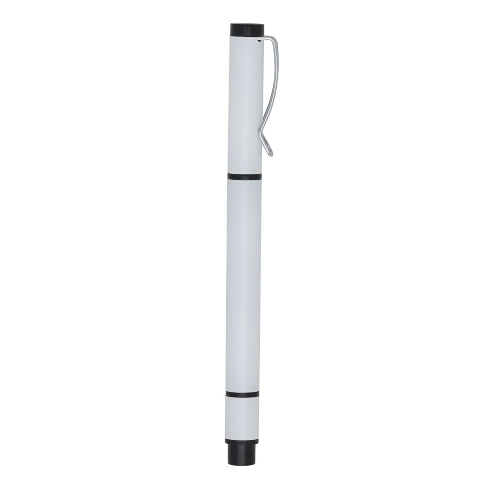 Caneta metálica com marca texto e carga esferográfica azul, ambas com tampas protetoras.