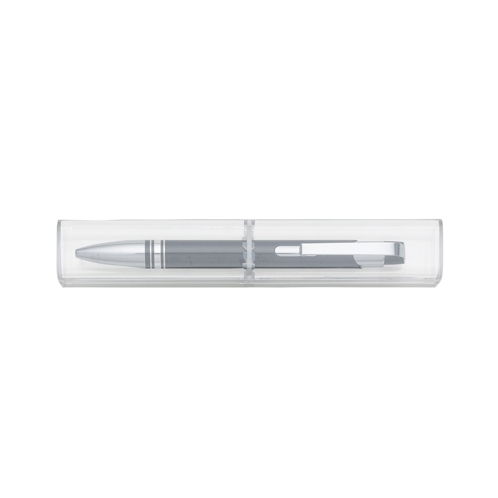 Conjunto caneta com estojo de acrílico. Caneta semimetálica com carga esferográfica azul e acionamento por clique. OBS.: PEDIDO APENAS MÚLTIPLO DE 50 PEÇAS!