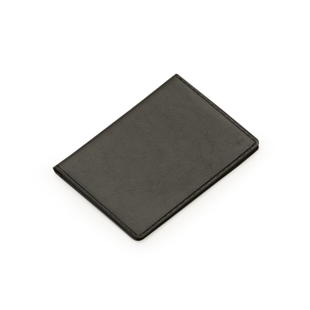 Porta-documento em couro sintético de frente e verso liso, parte interna com bolso plástico e duas divisórias para cartões. OBS.: PEDIDOS APENAS MÚLTIPLOS DE 50 PEÇAS!