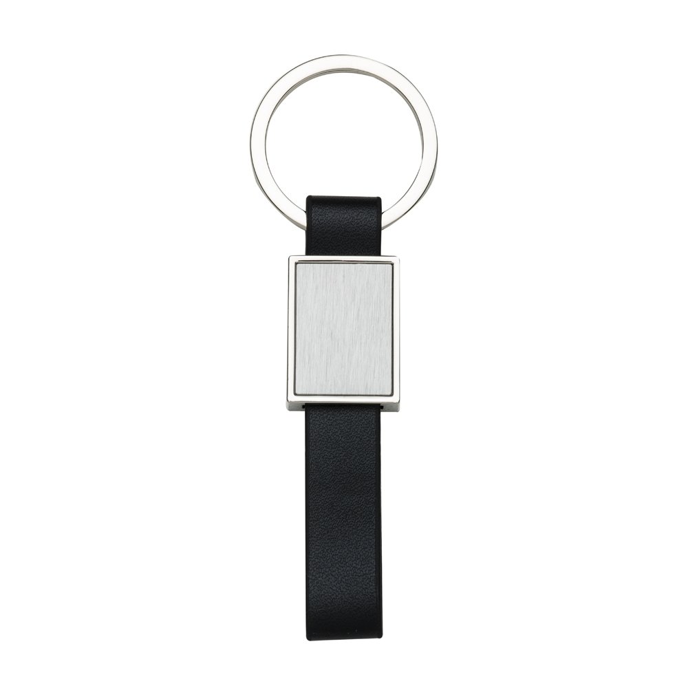 Um chaveiro leve e com design único. Feito em metal, possui formato retangular com chapa frontal com bordas destacadas e verso inteiramente liso. Ele também conta com uma alça em couro sintético e argola em metal, uma em cada ponta. Tudo isso confere o toque único de elegância e personalidade minimalista marcantes deste chaveiro.