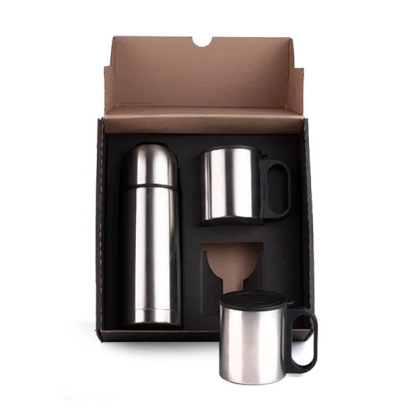 Conjunto de garrafa e duas canecas em Aço Inox.