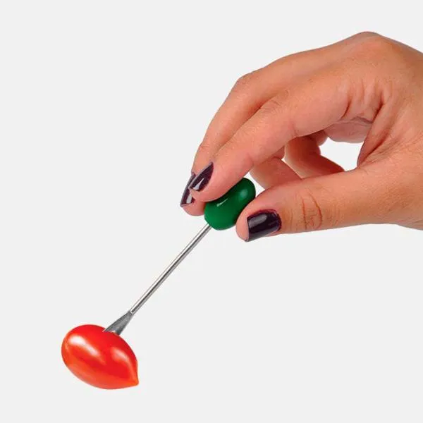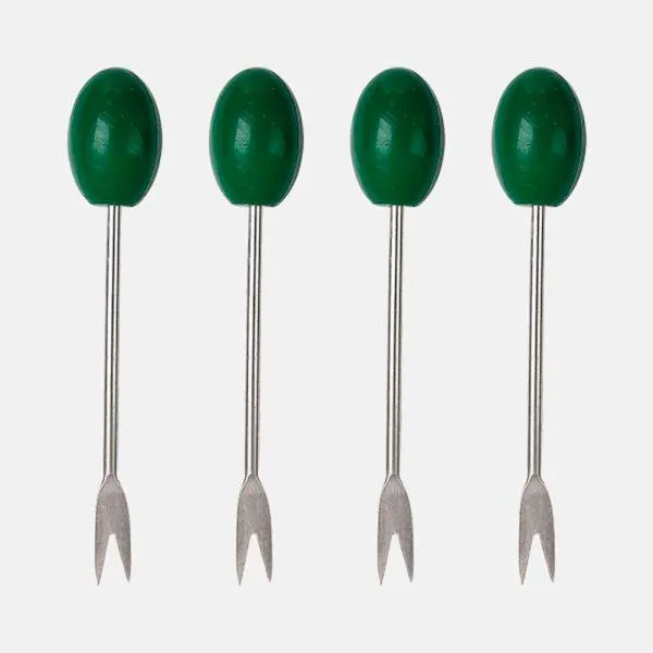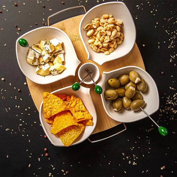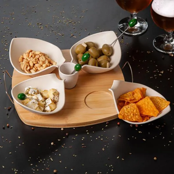 Conjunto para petisco em Bambu/Fibra de bambu. Acompanha cinco potes em fibra de bambu; Quatro garfos em aço Inox com ponta em formato de azeitona e base em bambu com alças em aço Inoxidável.