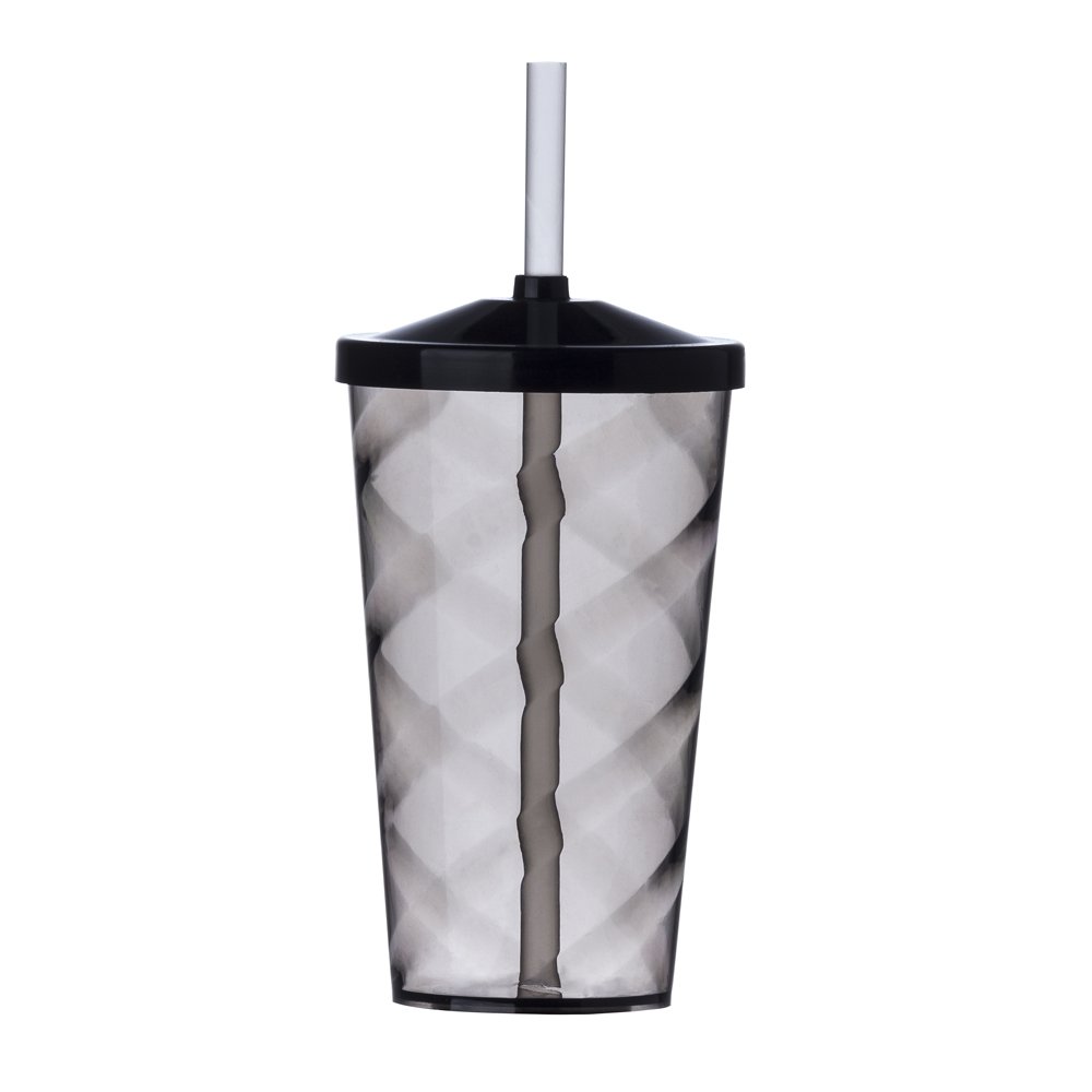 Um copo feito em plástico poliestireno, com detalhes em espiral, tampa resistente e capacidade de até 550ml. Acompanha canudo de plástico biodegradável.