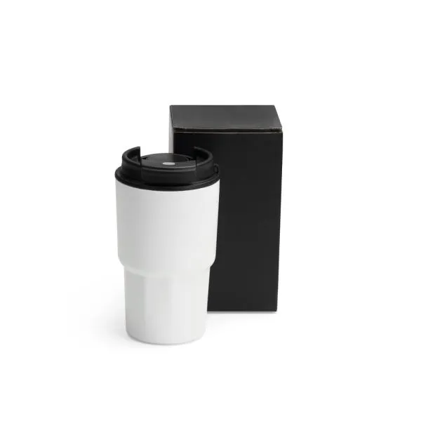 Copo térmico branco com tampa e capacidade de 450 ml.