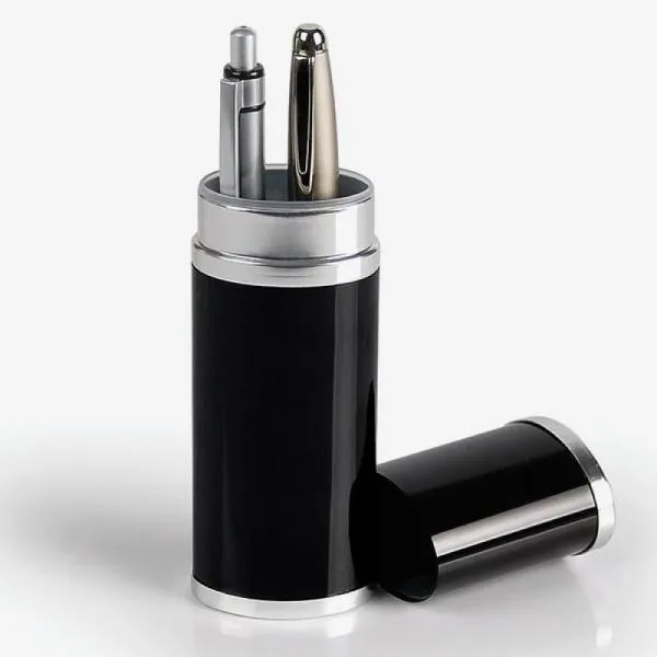 Estojo em alumínio preto com detalhes em cromado brilhante e tampa. Possui interior com espuma para proteção que acomoda perfeitamente duas canetas.