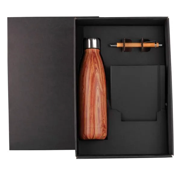 Kit de boas vindas. Kit composto por garrafa em aço inox com pintura amadeirada; caderno para anotações preto com capa dura e caneta esferográfica em bambu com ponta touch.