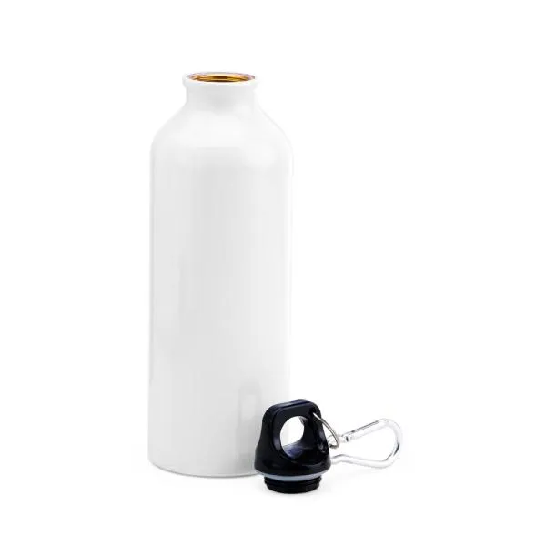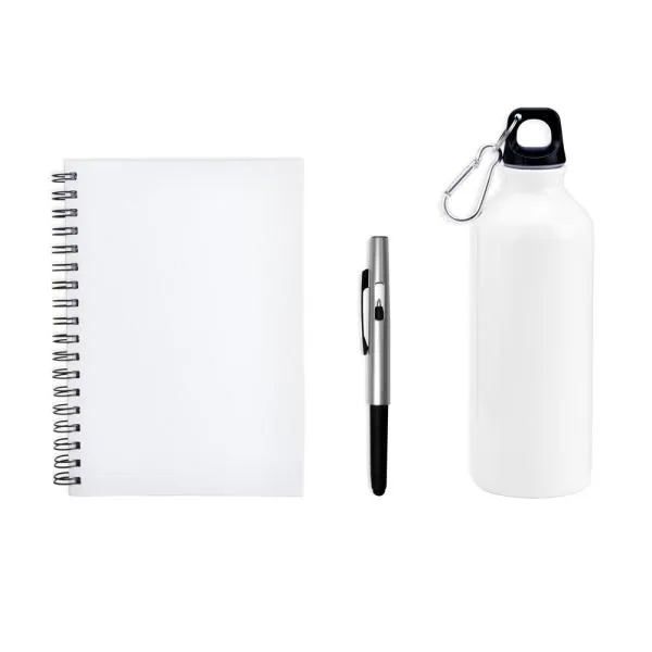 Composto por squeeze branco em alumínio revestido com verniz; caderno para anotações wire-o branco com capa dura e caneta esferográfica em ABS prata.