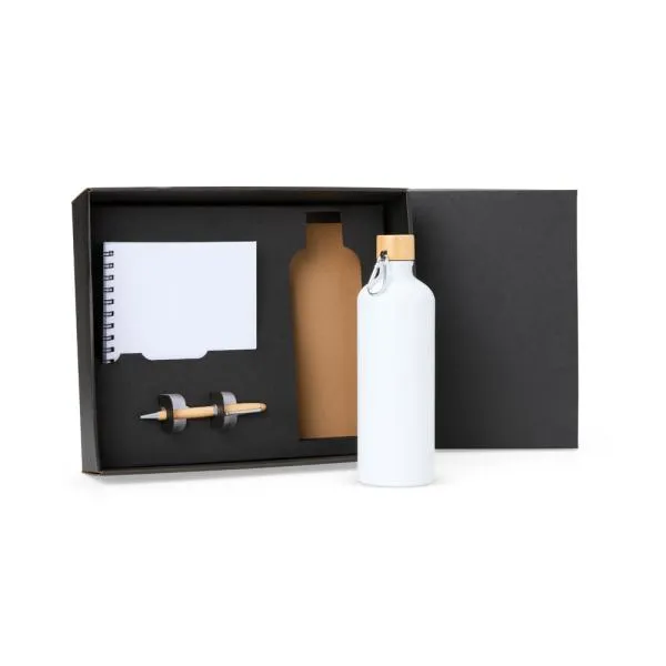 Composto por garrafa em alumínio na cor branca com capacidade de 1 litro; caderno para anotações wire-o branco com capa dura e caneta confeccionada em Bambu ecológico com detalhes em cromado fosco, possuindo carga esferográfica azul.
