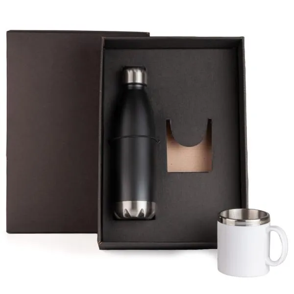 Kit garrafa e caneca. Composto por Garrafa em Aço Inox preta com tampa rosqueável e caneca confeccionada em aço inox escovado com acabamento externo em poliestireno branco.