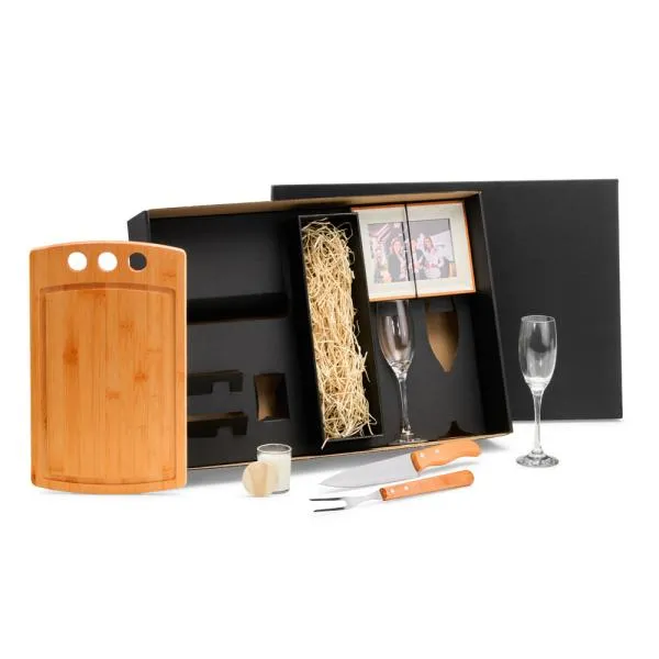 Composto por tábua para Cozinha em Bambu; faca 8″e garfo trinchante em Madeira/Inox; duas taças em vidro para Champagne; porta-retrato confeccionado em mdf; vela aromatizada de Lavanda e espaço para garrafa (NÃO ACOMPANHA GARRAFA).