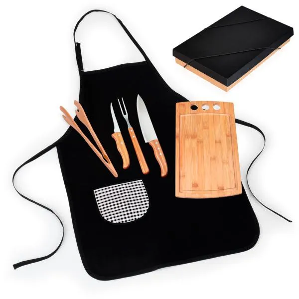 Kit para Churrasco. Composto por tábua com três furos e pegador de 30 cm em Bambu; faca 8″, faca 5″ para desossar e garfo trinchante em Madeira/Inox. Acompanha também um avental com bolso em Brim preto.