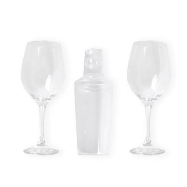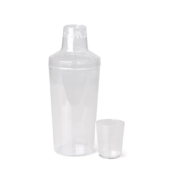 Kit composto por coqueteleira em plástico PS (poliestireno) com tampa, coador, dosador em ml e oz. Conta também com duas taças em vidro com capacidade de 490 ml cada uma.