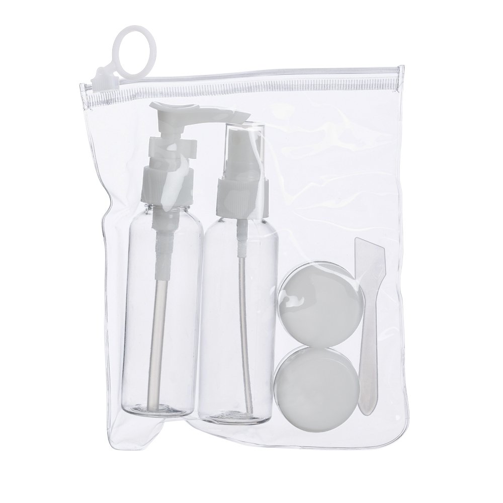 Kit viagem 5 peças em estojo ziplock. Contém frasco de 70ml com tampa spray frasco de 70 ml com tampa pump 2 potes de 10ml com tampa rosqueável e mini espátula fosca. Frascos plásticos e estojo em pvc com puxador plástico.