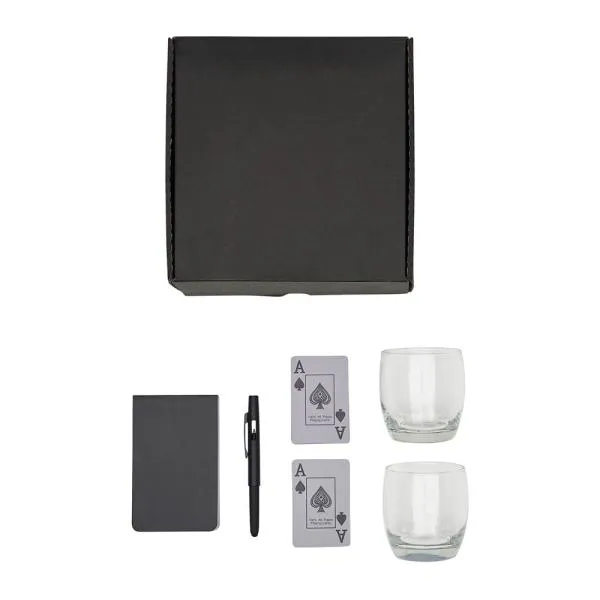 Kit para whisky e jogos. Conta com dois copos para whisky, baralho, caneta esferográfica e bloco para anotações.