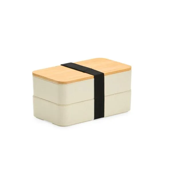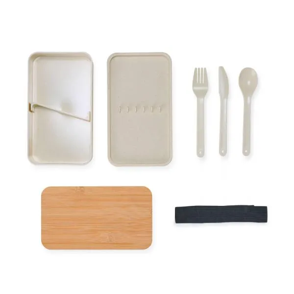 Composta por dois compartimentos, sendo um de 600ml com tampa de Bambu e outro com 500ml com suporte para talheres e talheres (colher, faca e garfo) de Fibra de trigo. Conta também com uma divisória removível e elástico para melhor fecho e transporte.
