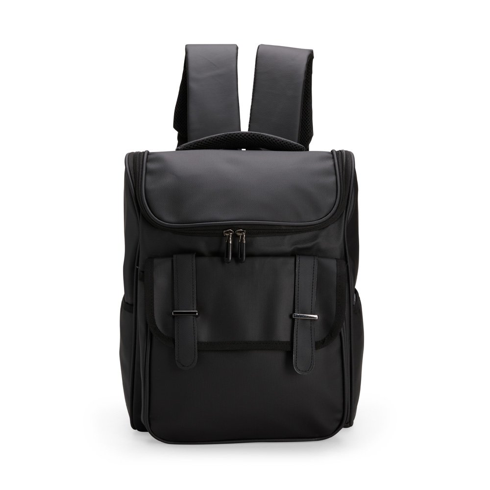 Mochila confeccionada em couro sintético impermeável com capacidade de até 18 litros. Possui compartimento interno para notebook de até 13 polegadas. Apresenta compartimento frontal com par de fivelas e fechamento em botões magnéticos, além de dois bolsos laterais. Possui área das costas e alças de mão e de costas com revestimento em tecido respirável.