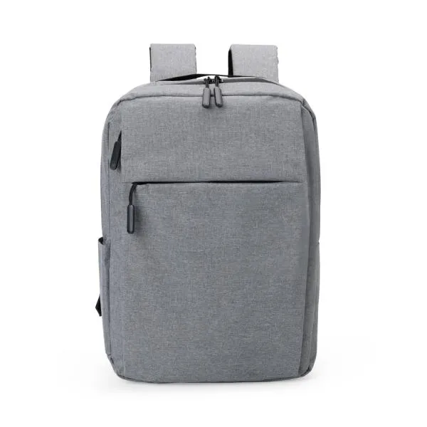 Mochila cinza em poliéster 300D.