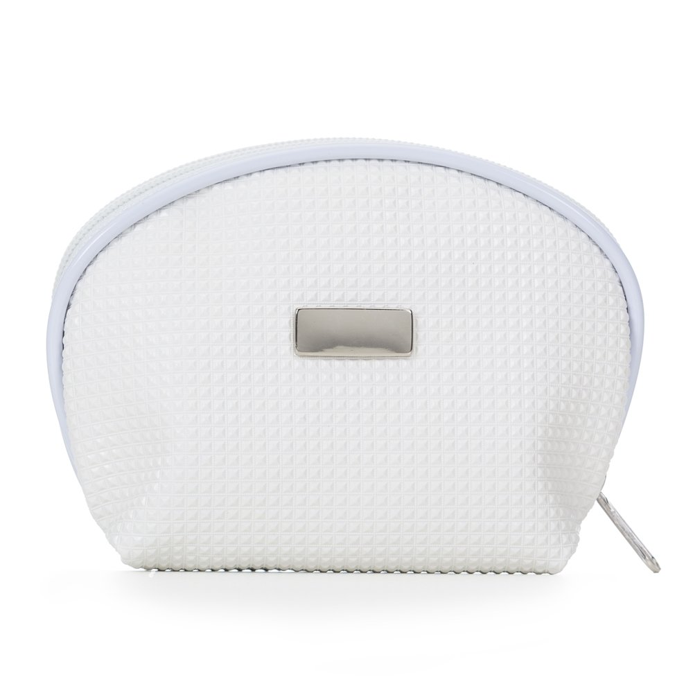 Necessaire em couro sintético texturizado com uma placa central para personalização. Parte interna revestida com cetim.