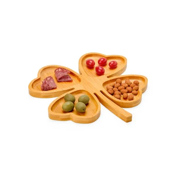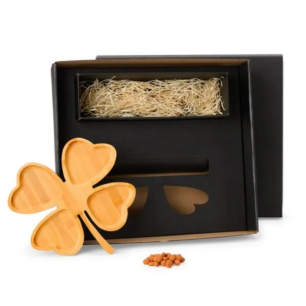 Conta com petisqueira formato de trevo em bambu; Espaço para garrafa com palha (NÃO ACOMPANHA GARRAFA).