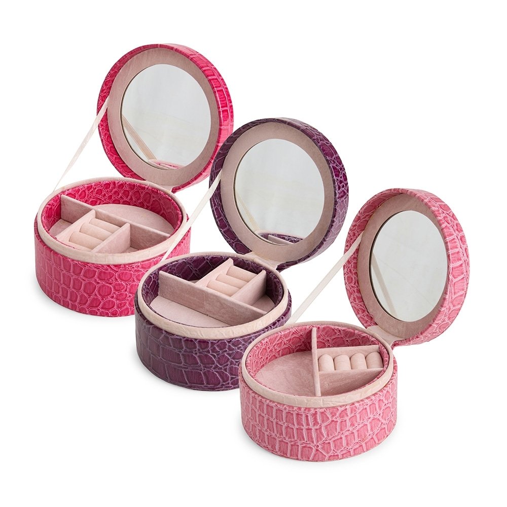 Porta joias em couro sintético com textura de crocodilo e formato arredondado. Conta com espelho no interior da tampa, além de dois compartimentos principais: o superior, removível, com quatro divisórias em diferentes tamanhos, uma delas com almofadas para abrigar anéis e brincos; e o inferior, com mais quatro divisórias.