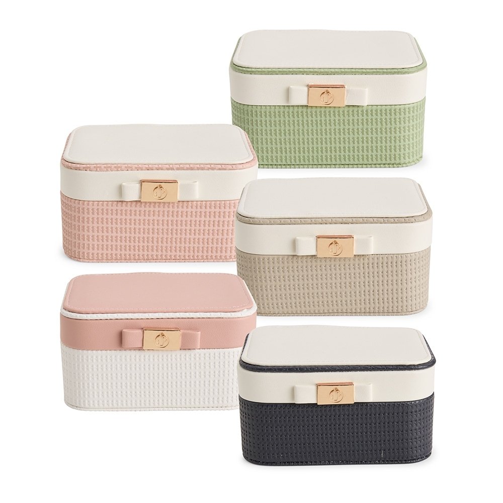 Porta-joias em couro sintético texturizado, com detalhe frontal em metal e revestimento interno em veludo. Possui cinco ganchos e um bolso costurado na parte interna da tampa. Conta ainda com dois compartimentos internos principais: o superior, com divisórias em tamanhos diferentes, incluindo uma repartição almofadada para anéis e brincos; e o inferior com divisória removível.