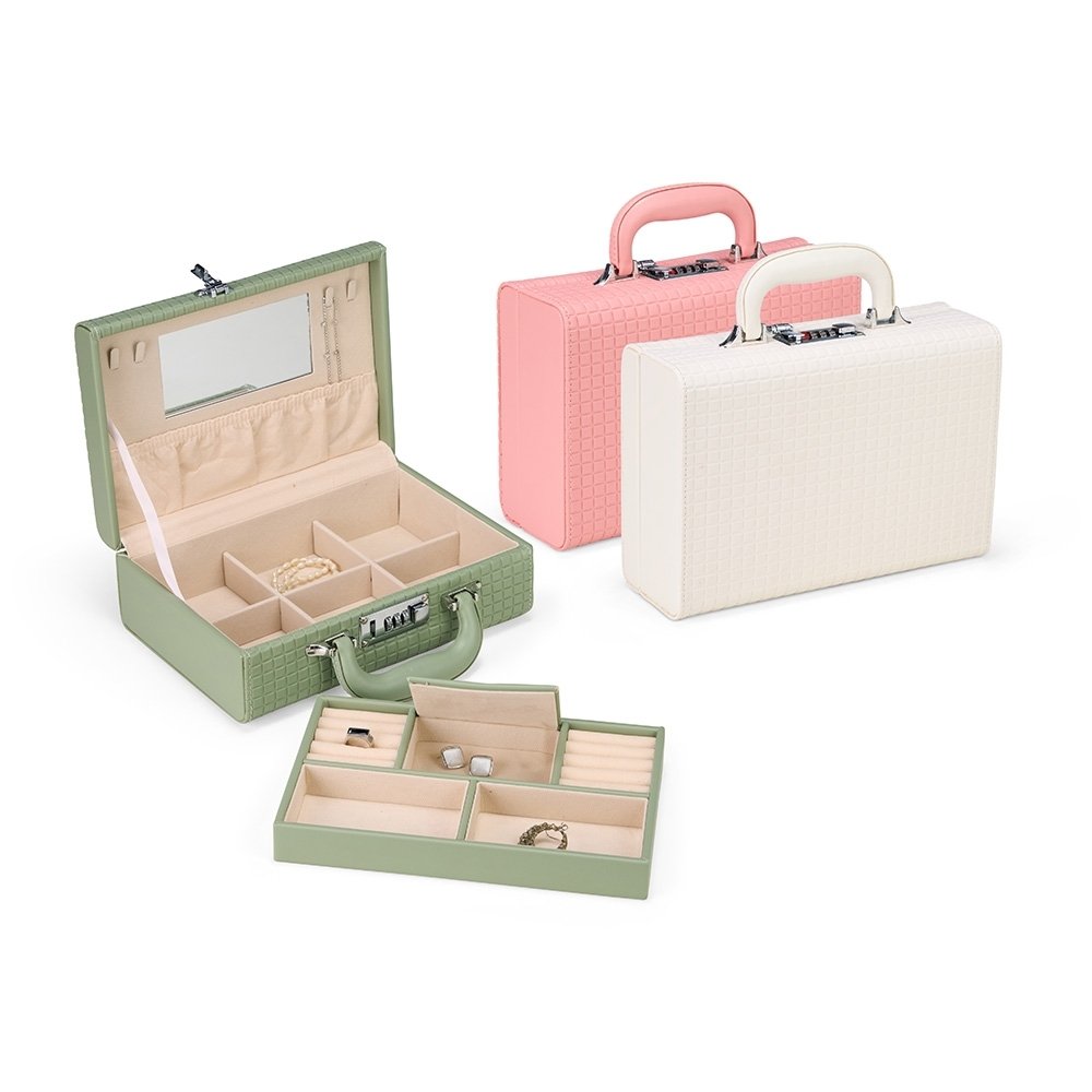 Maleta porta-joias em couro sintético texturizado, revestimento interno aveludado e fechamento por cadeado com senha numérica. Possui quatro ganchos, bolso com elástico e espelho retangular fixado. Conta ainda com dois compartimentos principais: o superior, removível, com cinco divisórias, uma com tampa e duas almofadadas para anéis; e o inferior, com seis divisórias removíveis.