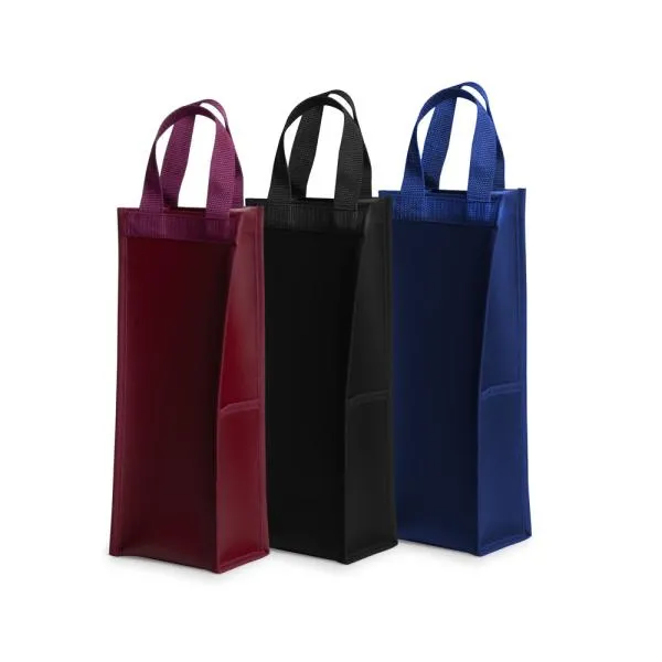 Porta vinho em Corvim bordô para 1 garrafa com alças e bolso lateral.