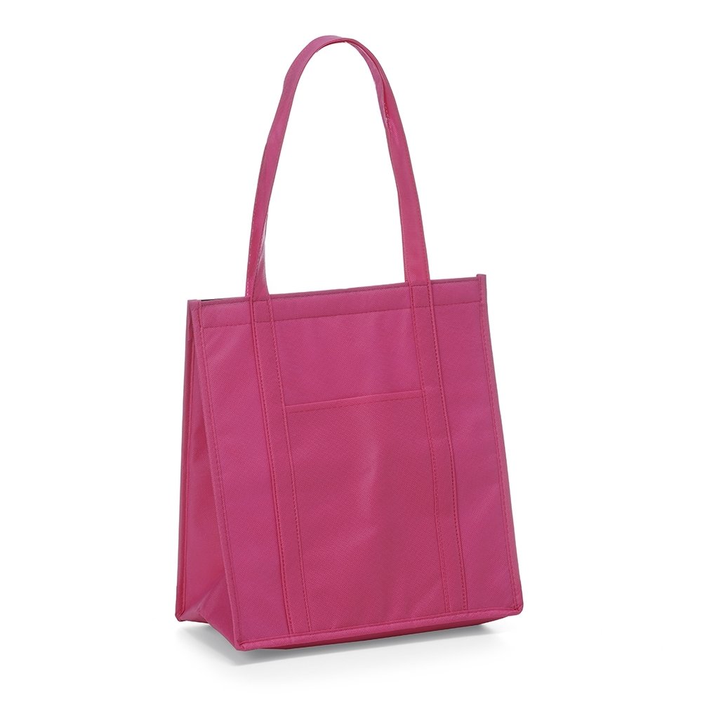 Sacola térmica com capacidade de 18 litros, contém fechamento em velcro e bolso frontal. Obs.: A capacidade de armazenamento com a sacola fechada é de aproximadamente 14 litros.