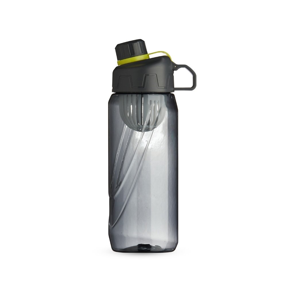 Squeeze plástico 800ml com infusor de bebidas. Com design em relevo, a squeeze possui tampa rosqueável com alça para transporte e tampa de proteção para o bocal.